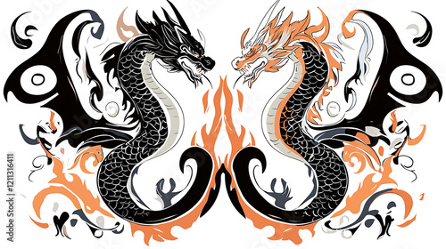 dragon, white, background, black, orange, left, right, vector, chinese, symbol, art, design, animal, illustration, fantasy, tattoo, decoration, asian, asia, culture, traditional, mythology, abstract, china, ornament, drawing, oriental, red, monster, silhouette, ancient, year, pattern, zodiac, myth, set, style, wild, new, festival, gold, icon, graphic, power, beast, japan, collection