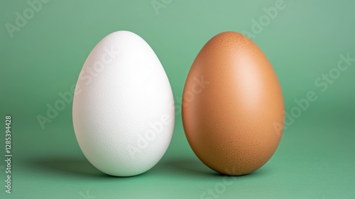 Two eggs, one white and one light brown, stand side by side against a muted green background. The image has a simple, clean aesthetic