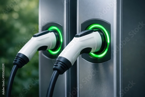 Two electric vehicle charging plugs in stations with glowing green rings, EV charging concept