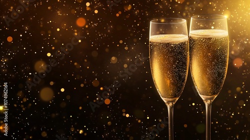 Two elegant champagne flutes filled with sparkling golden bubbly against a dark background with glittering bokeh lights, perfect for celebrations.