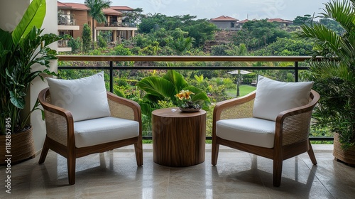 Two elegant wooden chairs with white cushions and a wooden table on a resort balcony, overlooking a serene green garden in the afternoon.