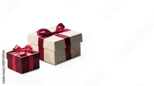 Two elegantly wrapped gifts with maroon and white ribbons.