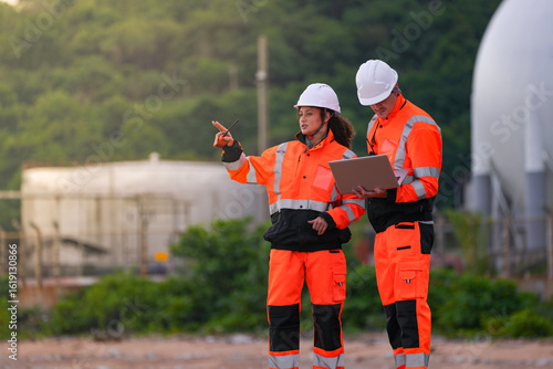 Two engineers in safety gear review project plans on a laptop and use a walkie-talkie at an industrial refinery site surrounded by greenery. Fieldwork safety and coordination.