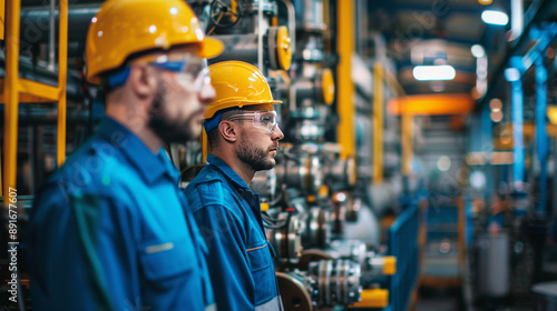 Two engineers wearing protective gear monitor industrial equipment in a factory setting, ensuring efficient operation.