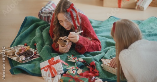 Two Female Friends Talking During Christmas Relaxing Preparing For Xmas Time