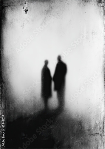 silhouette, couple, holding, hand, hazy, blurred, greyscale, vintage, image, photographic, light, shadow, figure, standing, foggy, outdoors, romantic, emotion, tenderness, love, stillness, mystery, aged, texture, grain, impressionistic, abstract, art, photo, portrait, couple, gentle, warmth, tender, human relationships, memory, past, distant, unclear, impression, atmosphere, mood, blithe, dramatic, soft, pair
