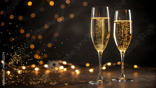 Two Flutes of Bubbly Champagne with Golden Bokeh Lights and Sparkles, Celebration, Festive Occasion, Cinematic Lighting