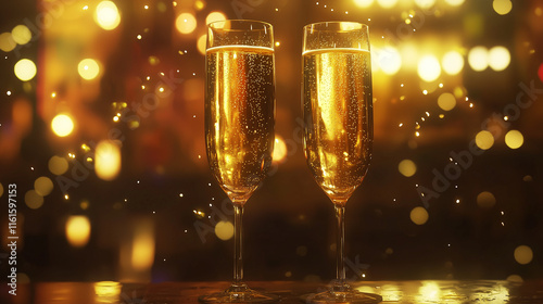 Two flutes of golden champagne with tiny bubbles rising, elegantly placed on a table with a bokeh background of twinkling fairy lights. Perfect for celebrations, luxury, or festive moments.