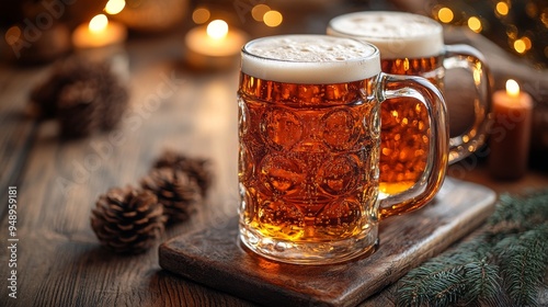 beer, christmas, holiday, drink, alcohol, celebration, winter, mug, table, wood, light, festive, cosy, warm, cheer, tradition, seasonal, amber, cold, beverage, refreshment, pub, bar, oktoberfest, party, happy, new, year, eve, rustic