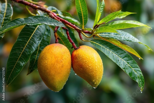 Two Fresh Mangoes Hanging from a Branch with Water Droplets, Surrounded by Green Foliage in Natural Light