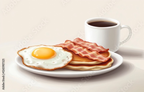 Two fried eggs, bacon, and pancakes on a white plate with a coffee cup in the background on a light gray table. Close-up of breakfast food at home or in a restaurant, isolated over a clean backdrop.