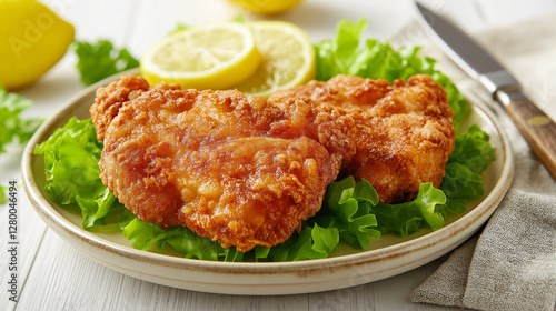 Two fried pork chops with lettuce and lemon slices