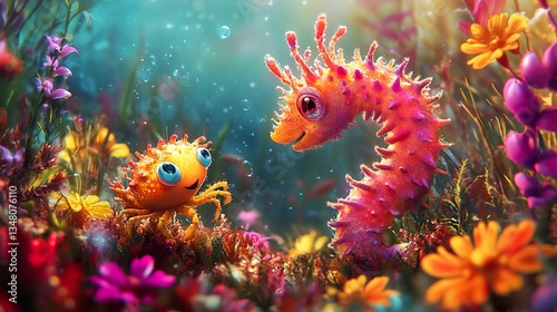 underwater, cartoon, creature, aquatic, orange, yellow, pink, red, purple, flower, plant, coral, sea, ocean, bubble, smiling, happy, cute, friendly, eye, small, large, spiky, colourful, illustration, art, fantasy, whimsical, bright, vibrant, light, depth, texture, seaweed, environment, marin, life, organism, character, imaginary, nature, scene, design, composition, detail, beautiful, background