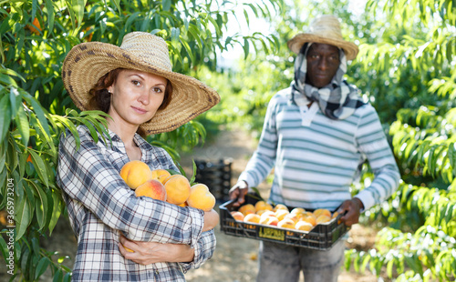 Two friendly gardeners working in their orchard, picking fresh ripe peaches..