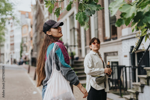 Two friends enjoying a casual walk in Amsterdam, engaging with the surroundings. Urban exploration and friendship captured in the city's charming streets.