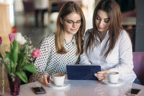 Two girls use a tablet while sitting in a cafe and drinking coffee