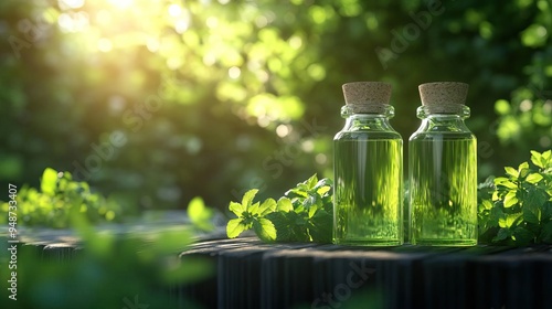 Two glass bottles filled with green liquid, surrounded by lush greenery, capturing the essence of nature and wellness.