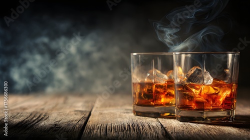 whiskey, bourbon, scotch, drink, alcoholic, beverage, refreshment, liquid, amber, brown, ice, cube, cold, glasses, tumbler, smoky, atmosphere, dark, background, wooden, table, rustic, sharpened, bar, lounge, evening, leisure, relaxation, indulgence, adult, luxury, smooth, aged, spirit, distillation, cheer, celebration, taste, aroma, warming, cool, chill, contrast, moody, warm, beautiful, colourful