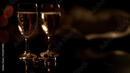 Two glasses of champagne with a pair of wedding rings. A night of celebration.