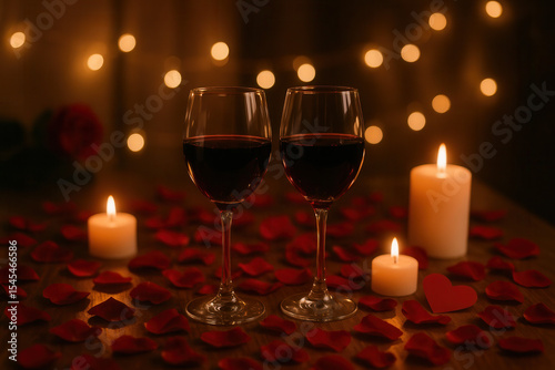 Two glasses of red wine sit on a table surrounded by rose petals and lit candles. Soft bokeh lights create a romantic atmosphere.
