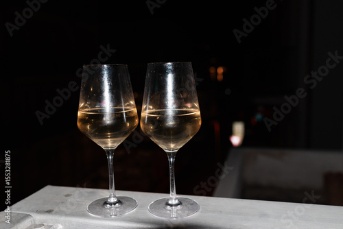 Two glasses of wine on the balcony ledge of a hotel in the summer evening, at night. Vacation time.