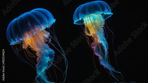 Two glowing jellyfish float gracefully as they swim in the dark