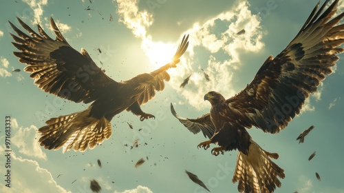 Two Golden Eagles in Flight, Feathers Falling from the Sky