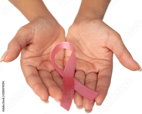 Two hands displaying pink ribbon for breast cancer awareness against white background