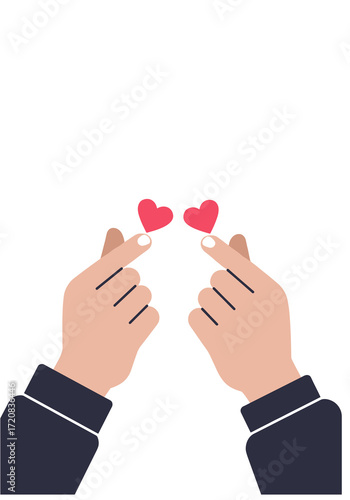 Two hands forming a finger heart with pink hearts in flat vector style