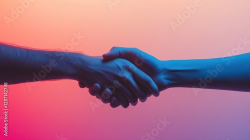 Two hands shake against a colorful gradient background symbolizing unity and cooperation in modern interactions. Generative AI