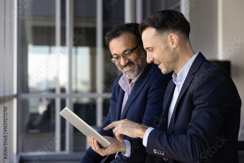 Two happy diverse younger and elder business colleagues using tablet computer for teamwork in office, discussing content on digital gadget, working on Internet product together, smiling, talking