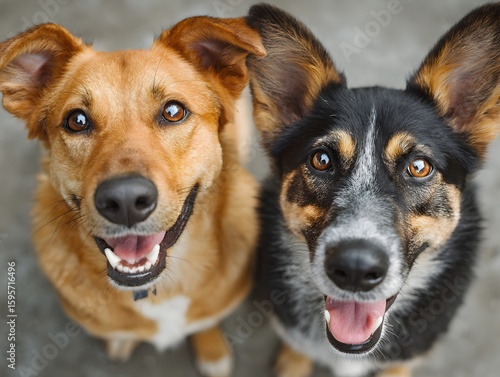 Two happy dogs with open mouths are looking up at the camera with bright eyes in an outdoor environment.