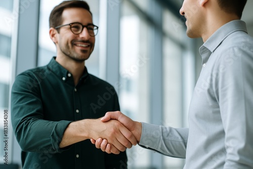 Two happy men shaking hands in office setting during business meeting or partnership agreement concept with natural light and modern lifestyle atmosphere. Ai generative