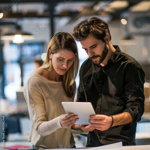 Two happy professional business woman and man workers working using digital tablet