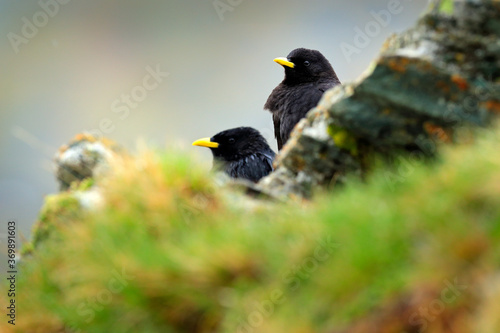 Two hidden Alpine Chough, Pyrrhocorax graculus, black bird sitting on the stone with lichen. animal in the mountain nature habitat, Austria. Alpine Chough with red leg and yellow bill.