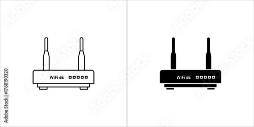 Two icons of a router with two antennas, one line art and one solid silhouette