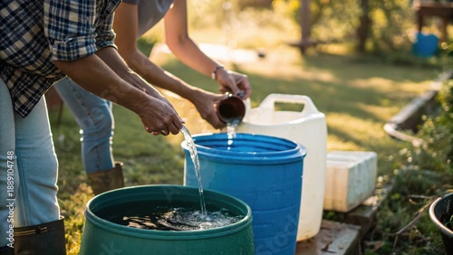 Two individuals are pouring water from containers into large barrels in a garden setting, highlighting an outdoor activity focused on water management.