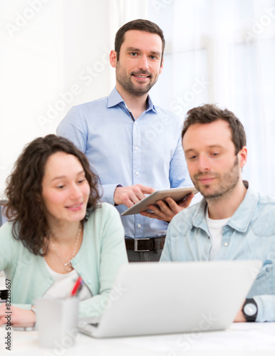 intern, student, group, supervisor, course, man, woman, attractive, smile, happy, working, tablet, laptop, office, desk, beautiful, serious, business