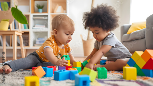 Two kids playing with colorful blocks on the floor in children's room