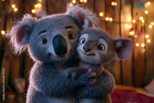 koala, koala, cuddle, hugs, hug, love, affection, cute, adorable, sweet, friendship, family, togetherness, tenderness, care, soft, fluffy, fur, eye, smile, joy, happiness, warmth, night, evening, light, glowing, background, blurry, wooden, rustic, home, cosy, interior, bedchamber, bed, blanket, cartoon, animated, motion picture, film, character, animal, mammal, australia, australian