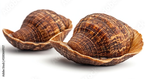 Two large brown snail shells, intricately patterned, rest on a white background. Their rich colors and textures are captivating.