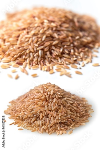 Two large piles of brown rice on a table or floor, ideal for use in food photography or as a prop