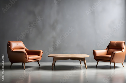 Two leather armchairs and round wooden coffee table against concrete paneling wall with copy space.