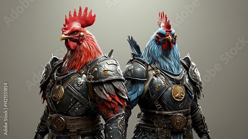 Two majestic roosters stand proudly in ancient armor, their vibrant plumage contrasting against the dark metal. A captivating scene of feathered warriors.