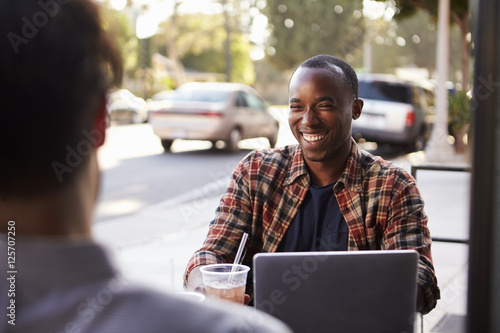 outdoors, day, two people, man, adult, young adult, 20s, 30s, black, diversity, cafes, cafes, sandwich bar, deli, small business, happy, smiling, laughing, laptop, communication, connection, friends, socialising, free time, relaxing, lunch break, coffee break, drink, refreshment, beverage, food and drink, sitting, casual clothes, selective focus, copy space, closeup, crop, horizontal