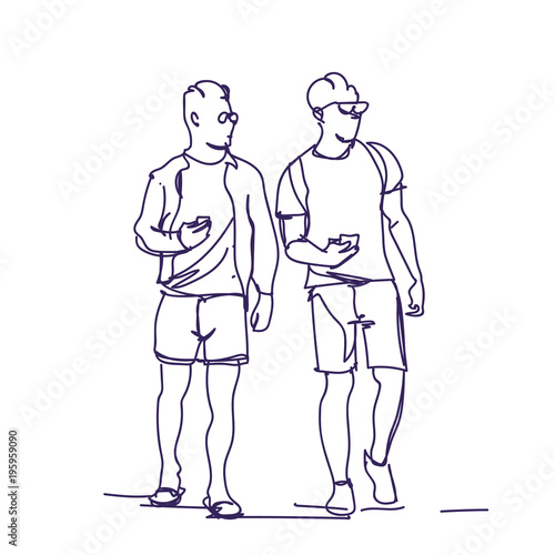 Two Man Standing Hold Smart Phones Talking Sketch Guys Doodle Vector Illustration