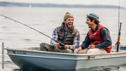 boat, lake, water, fishing, man, man, 2, friends, laughing, smile, happy, joy, fun, outdoors, nature, leisure, hobby, relaxation, day, summer, sky, cloud, horizon, river, rod, reel, line, bait, catch, fish, sunset, sunrise, adventure, travel, journey, vacation, sport, gear, tackle, clothing, vest, beanie, cap, hat, beard, casual attire, outdoorsman, scenic