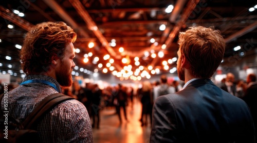 Two men stand together, gazing at a vibrant event filled with lights and activity, capturing the essence of connection, friendship, and the excitement of gatherings.