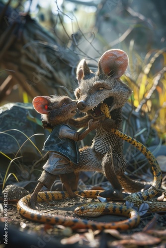 Two mice playfully interact with a snake in a natural setting