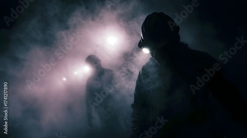 navigate, dark, smoky, underground, tunnel, smoke, light, mine, miner, men at work, silhouette, headlamp, beam, fog, misty, haze, atmospheric, mysterious, adventure, danger, gritty, dramatic, intense, shadow, glow, illumination, figure, team, duet, navigating, searching, helmet, gear, equipment, dust, vapour, ambient, texture, black, white, purple, pink, grey, night, cave, motion